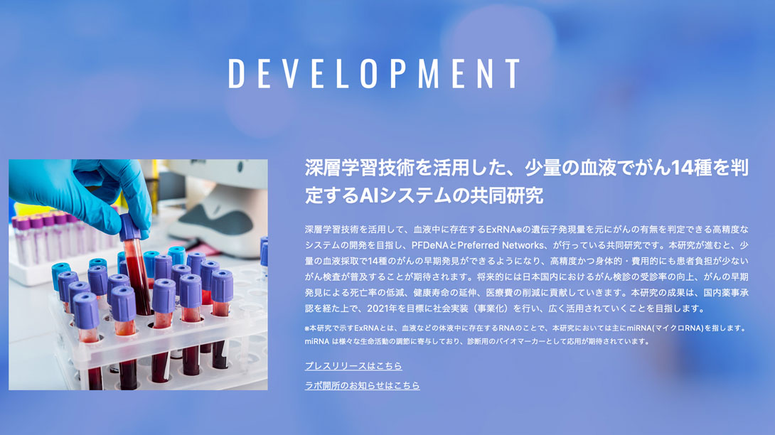 PFNの深層学習技術などを、医療分野の課題解決に活かす。ヘルスケアデータの活用: DeNAが保有するヘルスケアデータとAIを組み合わせることで、より精度の高い医療サービスを提供する。血液をAIで解析し、がんを見つけるAIなども提供しています。