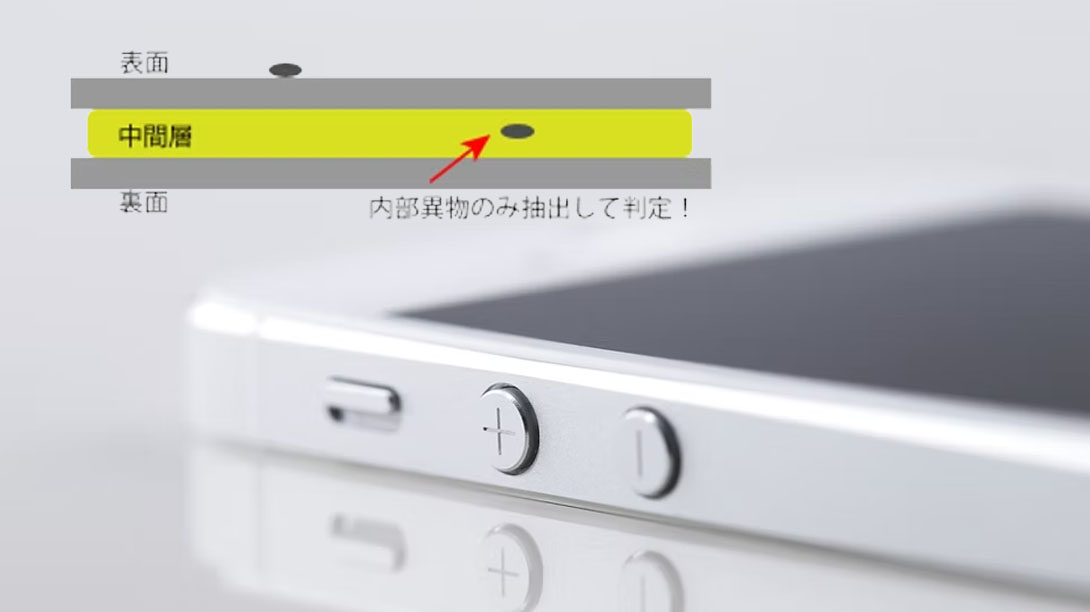 スマートフォンカバーガラス AI外観検査装置は、スマートフォンカバーガラス向けのAI外観検査装です。カバーガラスの表側・裏側の両面に付着した埃や傷などを、AI技術を用いて高精度に検出します。また、AIを用いることで、人間の検査員が目視で行うような官能検査(微妙な欠陥の判断)を自動化し、安定した検査品質を実現します。