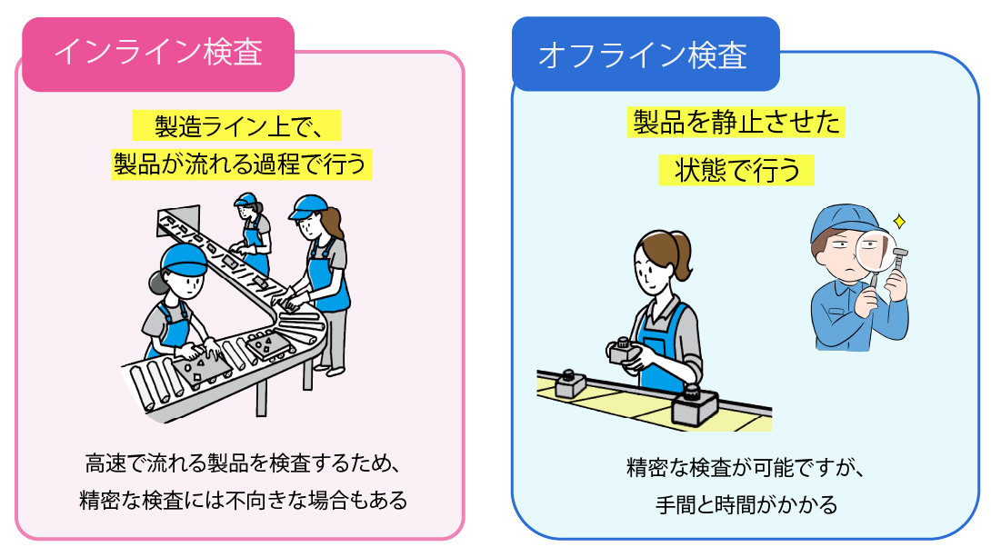 インライン検査は、製造ライン上で製品が流れる途中に行う検査です。主に外観の大きな異常や欠陥の検出に用いられます。生産ラインを止めずに検査できるため効率的ですが、高速で処理されるため、特に目視検査では微細な欠陥や不良品を見逃すリスクがあります。