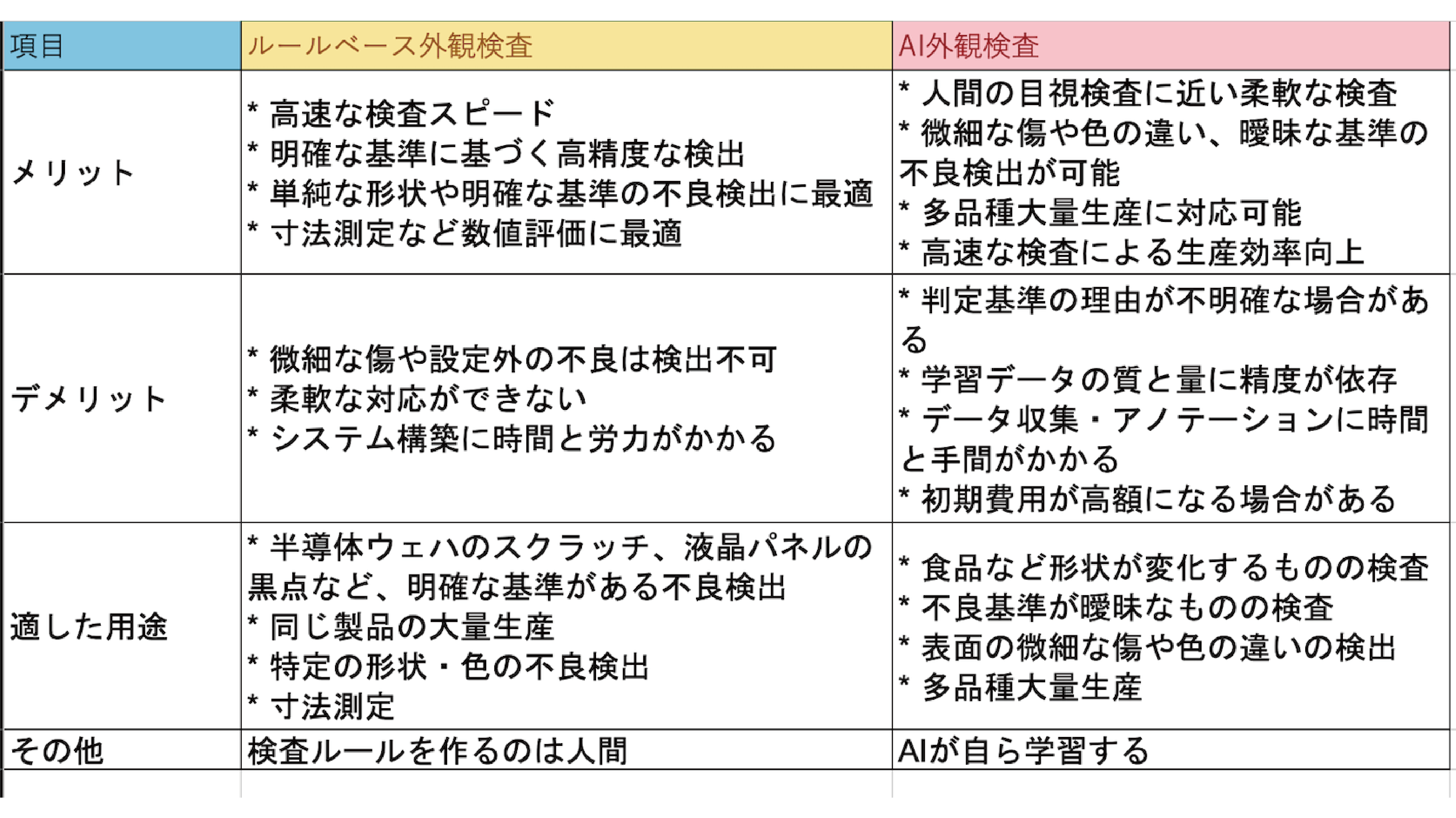 比較的単純な検査であればルールベースで十分な精度を得られますが、人間のような勘や経験を活かし、柔軟な対応を求める場合にはAI外観検査の方が適しているでしょう。