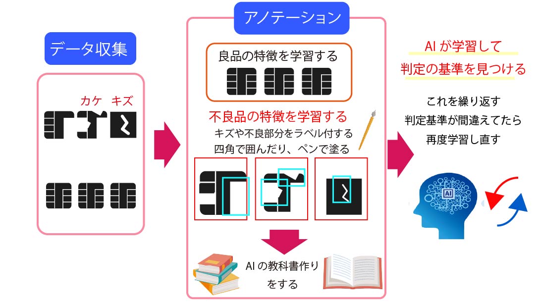 アノテーションとは、AIが「何が良品で、何が不良品なのか」の基準を学ぶためのデータです。人間も、たくさんの教科書や参考書を見て知識を身につけ、勉強しますよね。