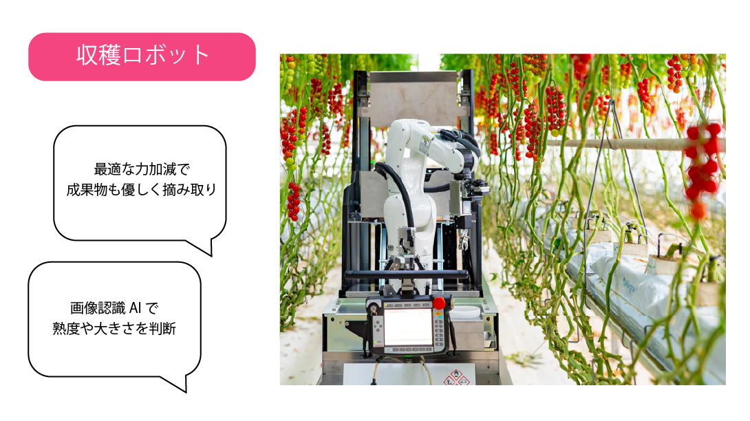 トマトやイチゴ・キャベツなどの野菜や果物の収穫にも対応できるロボットが開発されています。